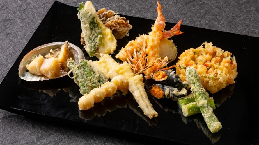 ・天ぷら(海老二本、鱚、鯛梅しそ、帆立と鮑の盛り合わせ、雲丹磯辺揚げ、穴子、野菜六品、かき揚げ)