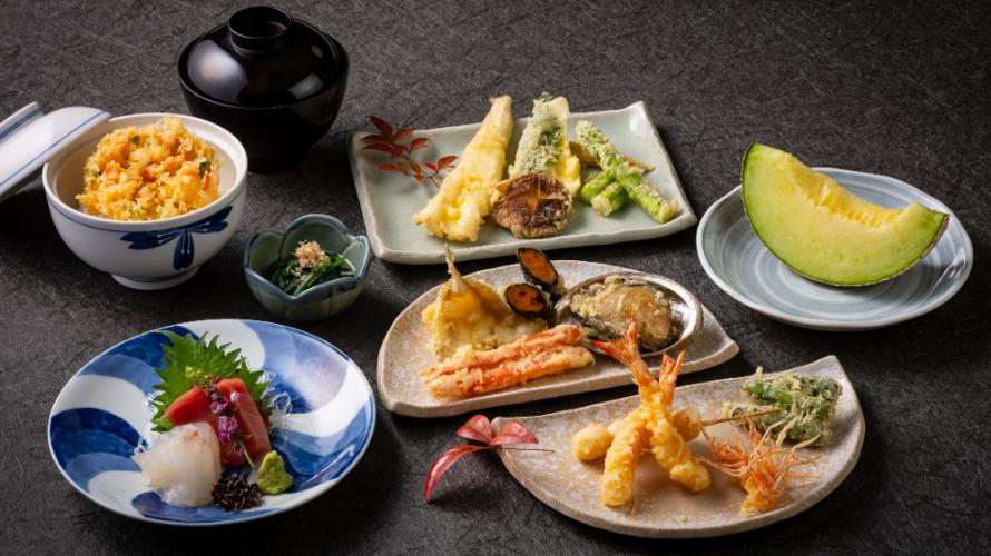 ・天ぷら(海老二本、鱚、鯛梅しそ、鮑、雲丹磯辺揚げ、ずわい蟹、穴子、野菜六品、かき揚げ)