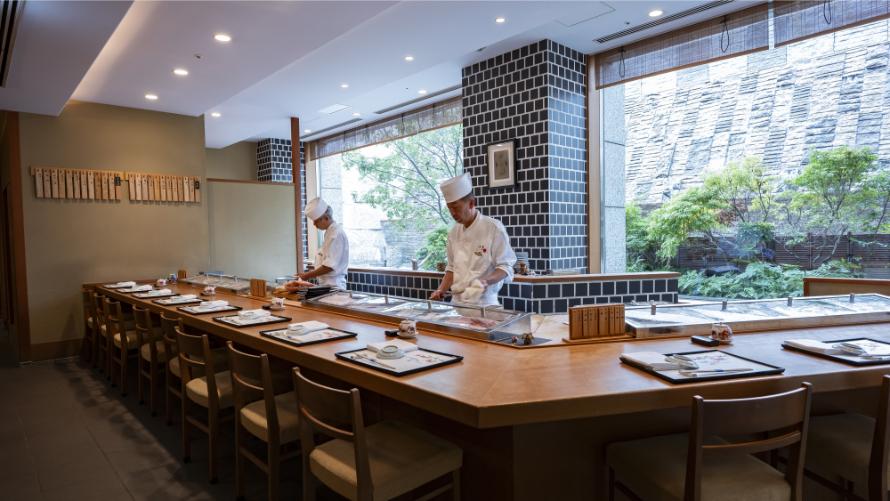 大きな窓から光が差し込む明るく活気ある店内。窓の外には大きな滝の景色が広がり、癒しの空間を演出。夜には滝のライトアップで昼間とは違った幻想的な雰囲気へ一変します。板長自らの目利きで選び抜かれた食材は、洗練された技術で極上の江戸前寿司に。定番の本鮪、伝統のタレを使用したふわふわの穴子など質にこだわった握りやつまみ、季節の一品料理をご堪能いただけます。板前が目の前で握る様子をお楽しみいただけるカウンター席、ゆったりとしたテーブル席、接待やお祝い事におすすめな個室・半個室をご用意しております。こだわりの寿司とともに静かに愉しむ、至高の時間をお過ごしください。