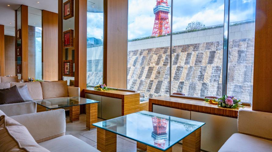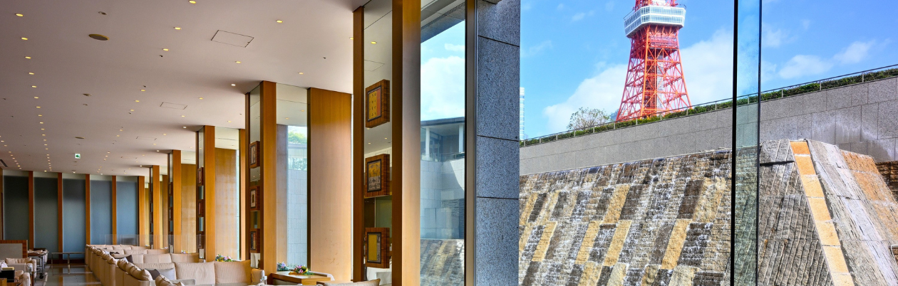 ホテルエントランスフロアに位置するラウンジ。フロアの一部が弧を描くように外に突出した窓側席からは、一面に広がる滝の景色と、東京のシンボル“東京タワー”をご覧いただけます。ご友人やご家族との楽しいひとときや、ビジネスでのご利用など幅広いシーンでご利用いただけます。パティシエこだわりのスイーツ、香り高い紅茶とともにゆったりとした時間をお過ごしください。