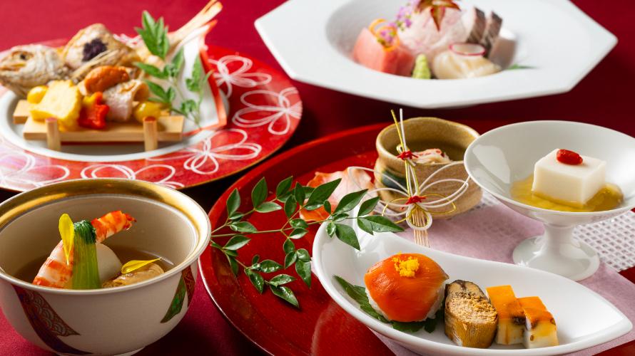 健康長寿の海老や出世魚の鰤など縁起が良いとされる食材を盛り込んだ花籠点心。御食事には運気がうなぎ上りになるよう願いを込めた鰻ちらし寿司をご用意いたしました。2026年芝大神宮強運カラーを取り入れた彩り豊かなお食事をお楽しみください。
