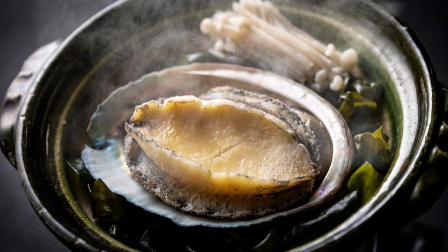 活蝦夷鮑を酒蒸しにした磯の香りが広がる贅沢な一品。