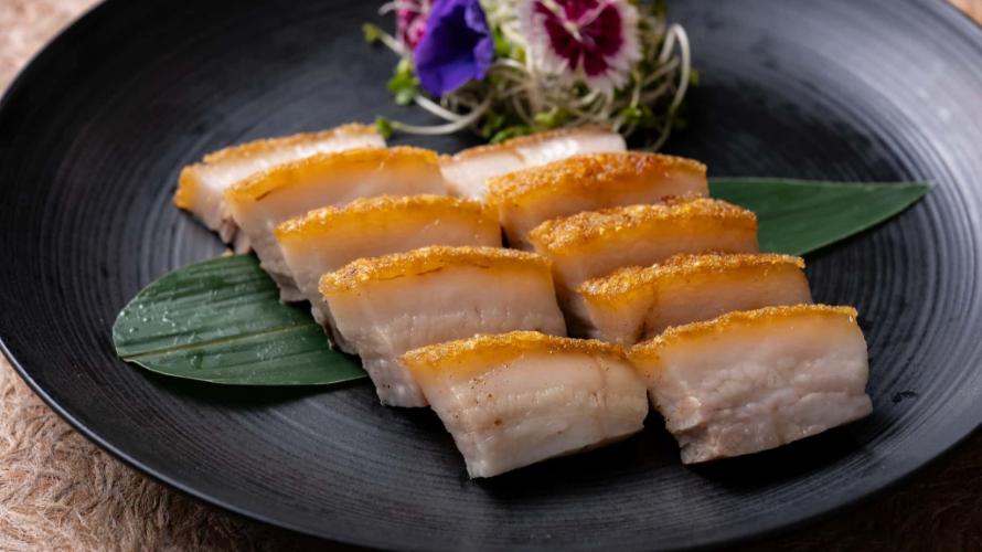 豚の皮付きバラを使用、中国料理特有の焼き窯で表面がサクサクになるまで吊るし焼き、釜内の温度や時間など高度な技術を要する。