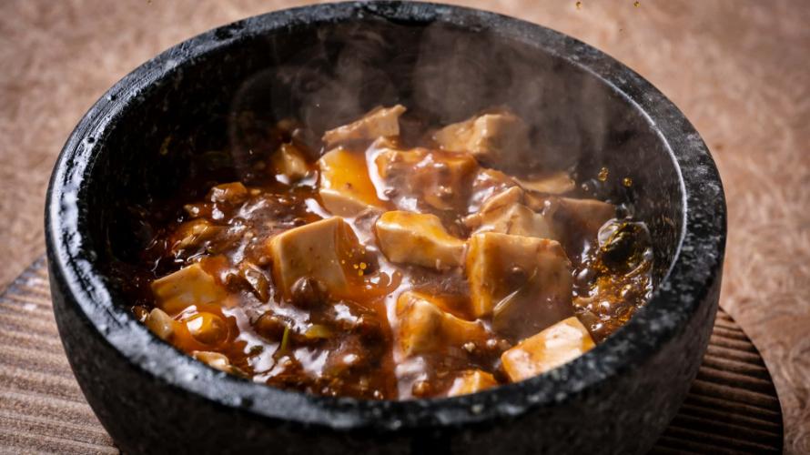 石鍋であつあつに仕上げた麻婆豆腐。口に入れると痺れるような辛さの奥に