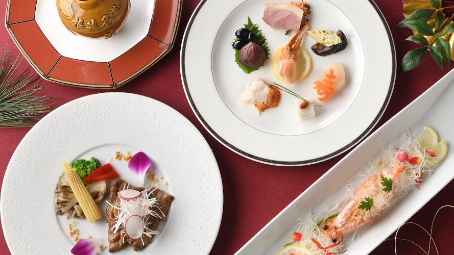 健康長寿を象徴する海老、子孫繁栄を願う豚肉、数の子など縁起の良い食材を取り入れた開運プレート。