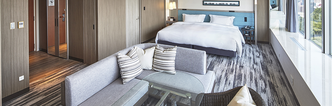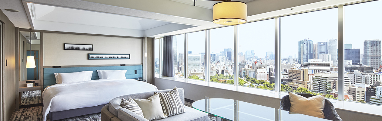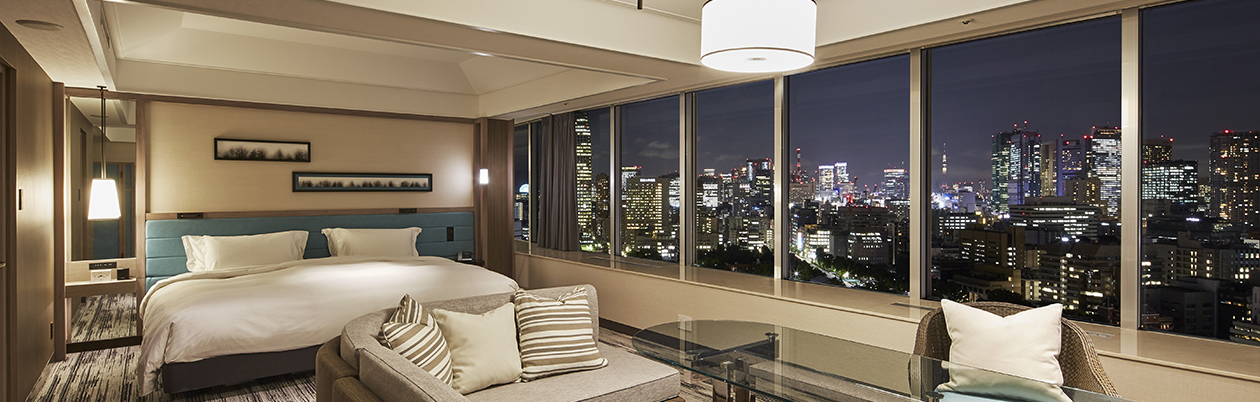 一面に広がる窓から東京の景色を見渡せるキングベッドを備えた50㎡のジュニアスイートルーム。