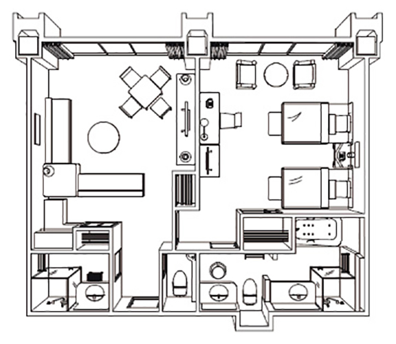 リビングスペースとベッドルームを備えた76㎡のスイートルーム。