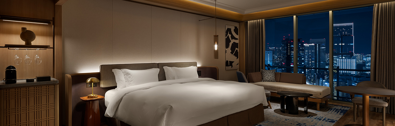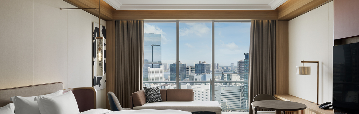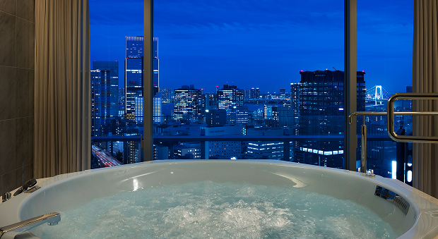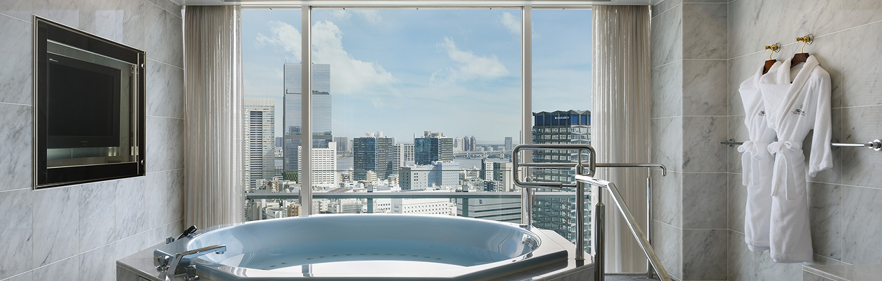 広々としたブロアバスから東京の絶景を望むスイートルーム。朝は溢れる光とともに、夜は煌めく夜景を眺めながら、至福のバスタイムを。