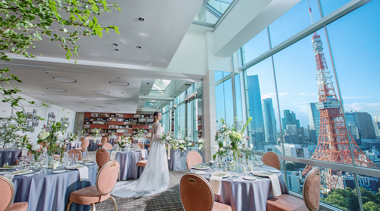 地上33階の天空に浮かび、開放的な雰囲気あふれるスカイバンケット。時間とともに移ろう空の色とガラス越しに広がる東京のパノラマがウエディングシーンのスクリーンとなり、おふたりを彩ります。(10〜60名さま)
