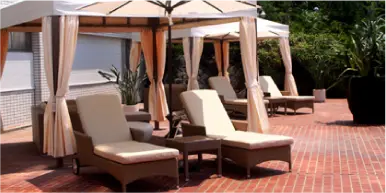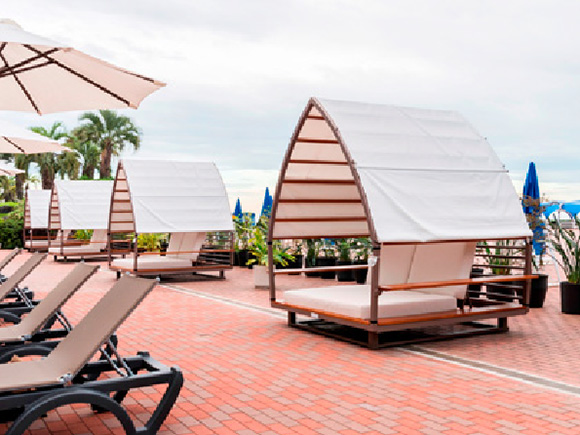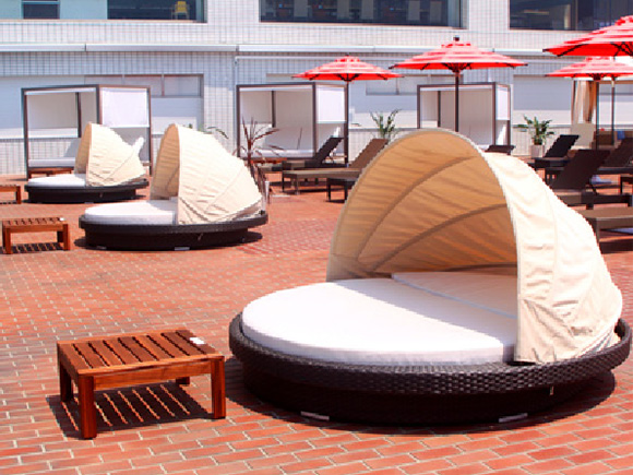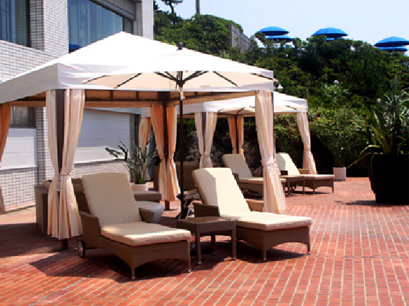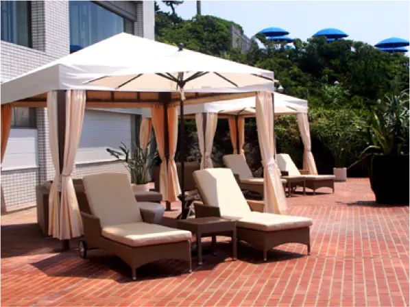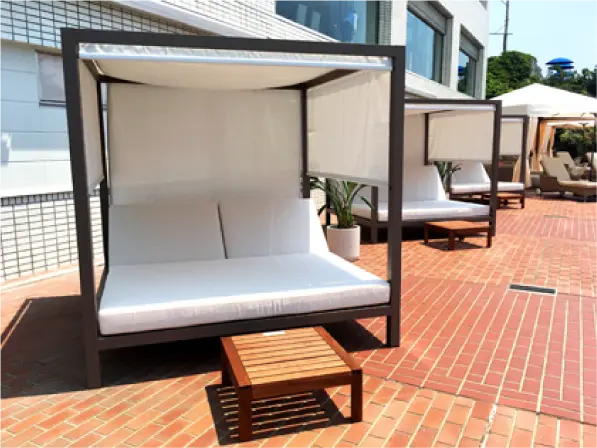 ガゼボ(ソファー4名用、チェア2台、テーブル1台)、デイベッド2台、パラソル1本、テーブル1台