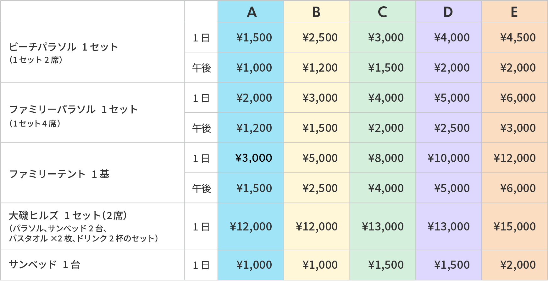 眺望や人数に合わせてお選びいただけるパラソルやファミリーテントなどが、エリア別に点在。