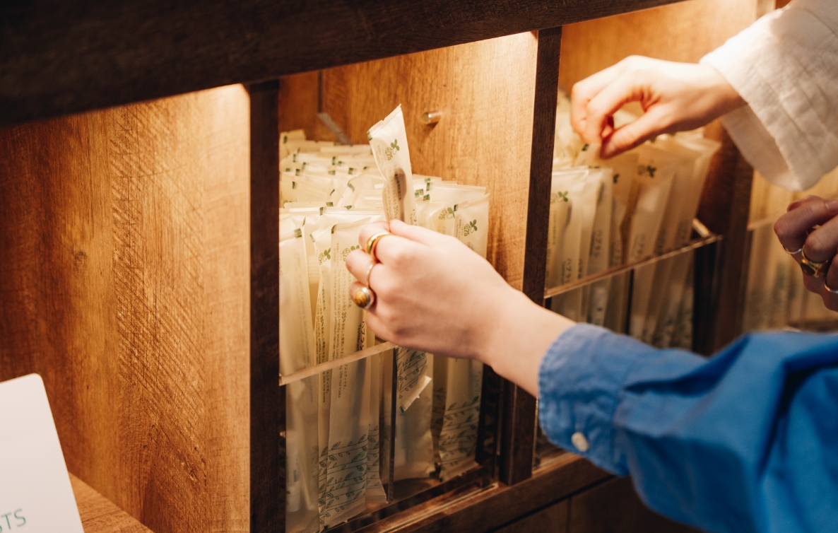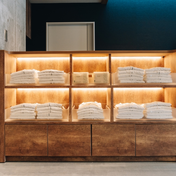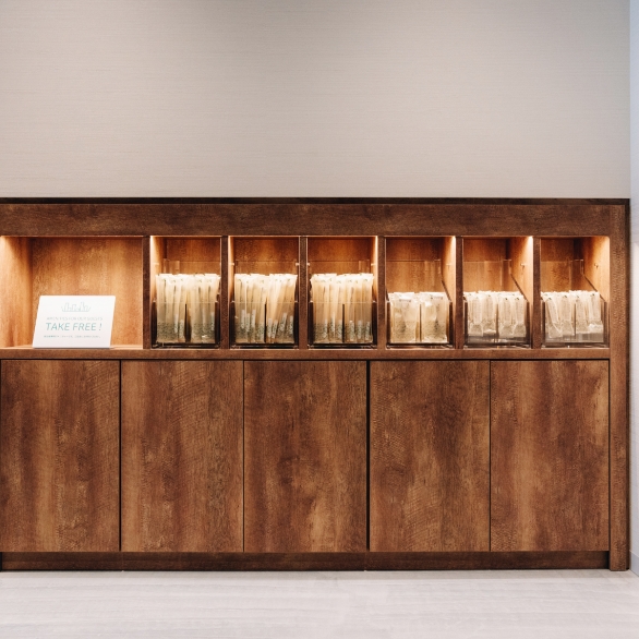 アメニティはロビーにてお客さまご自身でご選択いただけます。ナイトウェア・歯ブラシ・レザー・ヘアブラシ・紙コップがございます。