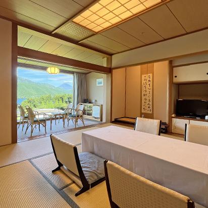 箱根芦ノ湖畔に面した趣のある客室全室からは四季折々の芦ノ湖と箱根外輪山、霊峰富士を望めます。