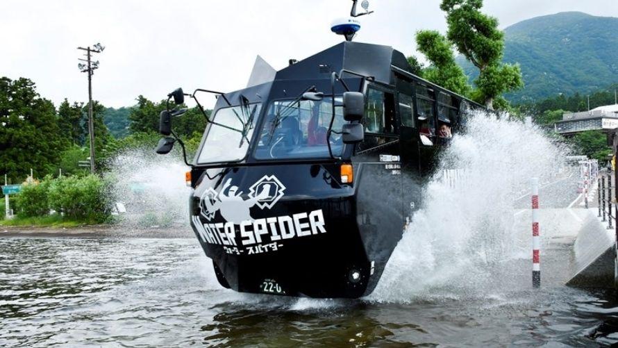 ニンジャバスは、箱根園より水陸両用バスに乗り込み、芦ノ湖へダイブする爽快なアクティビティーです。約15分間の芦ノ湖クルーズでは、芦ノ湖や富士山を含めた周辺の山々をじっくりと楽しめます。