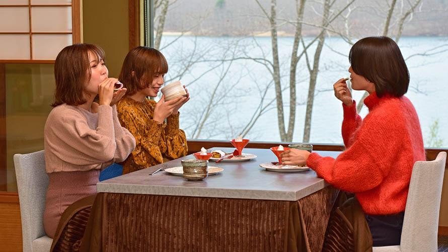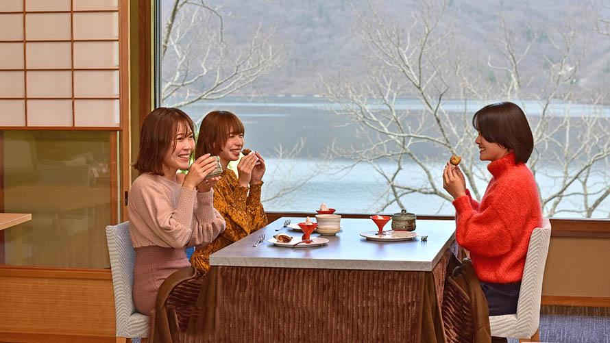 テーブルタイプのこたつを用意するため、どなたでもご利用いただきやすく、こたつで温まりながら大きな窓から臨む雄大な芦ノ湖をお楽しみいただけます。
