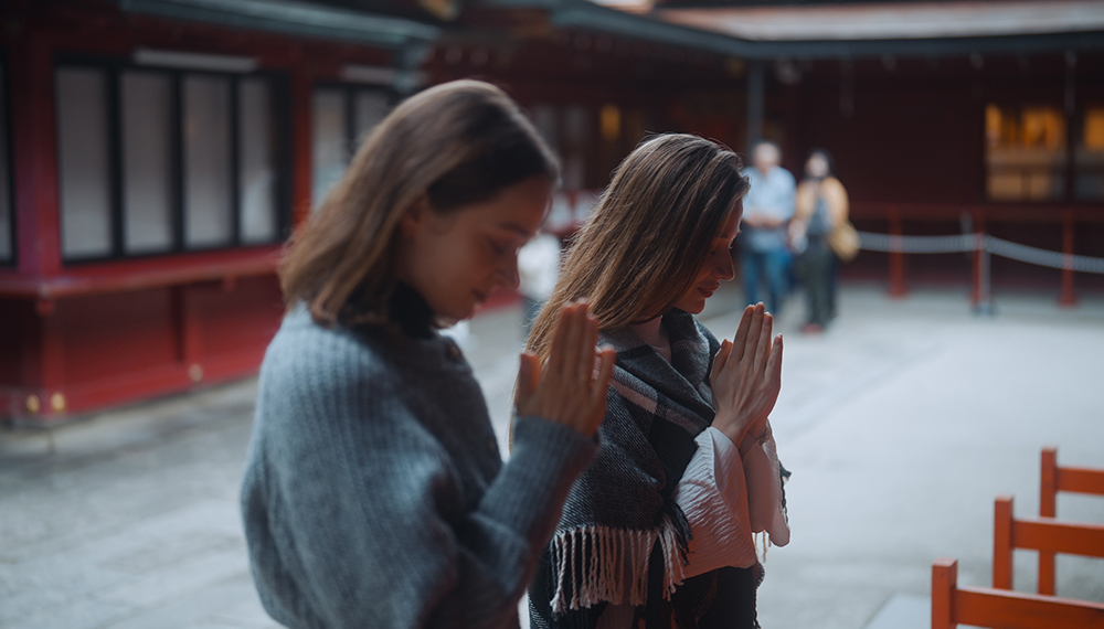 神々に護られた宿 龍宮殿を中心に、周辺4つの神社を参拝いただく開運体験。箱根神社を参拝し、平和の鳥居で記念撮影。