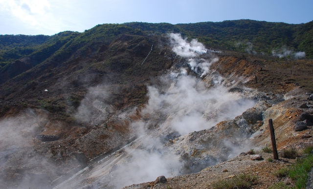 龍宮殿から車で15分程の場所にある大涌谷。今でも火山活動が行われており、噴煙が立ち昇る迫力のある風景を見ることができます。