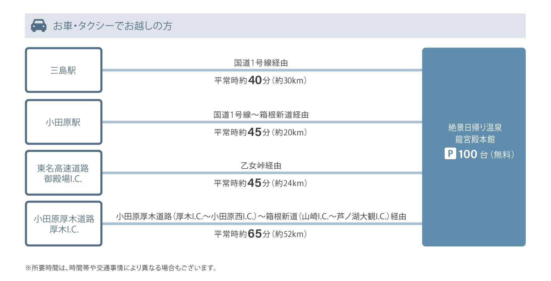 ご来館はお車・公共交通機関などをご利用いただけます。小田原駅・元箱根からの無料送迎サービスも提供しております。