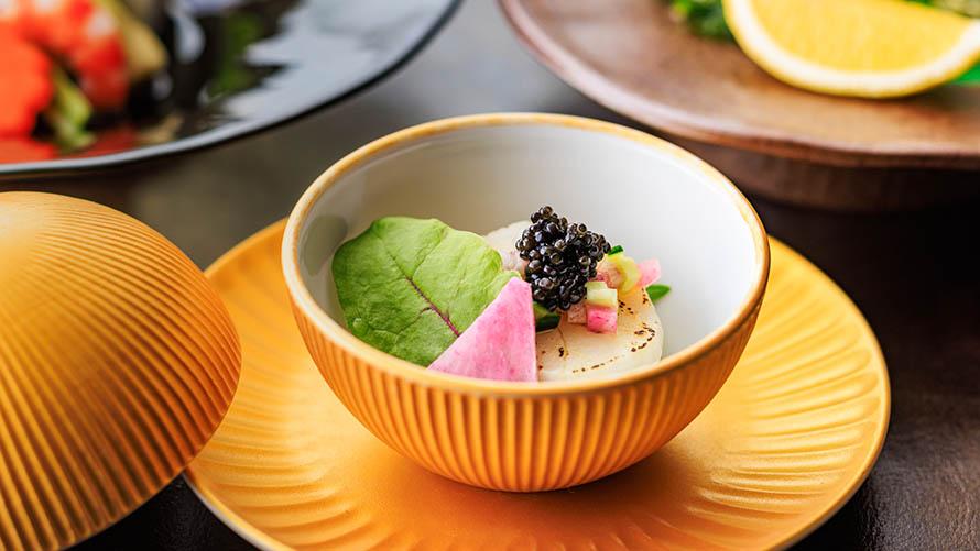 《先 付》 ~龍宮殿金宝珠~ 帆立オイル仕立て 彩り野菜 キャビア