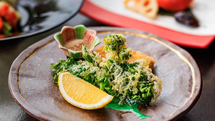 鯛を洋風に香ばしく揚げ、ほろ苦い蕗の薹を添えた一品。