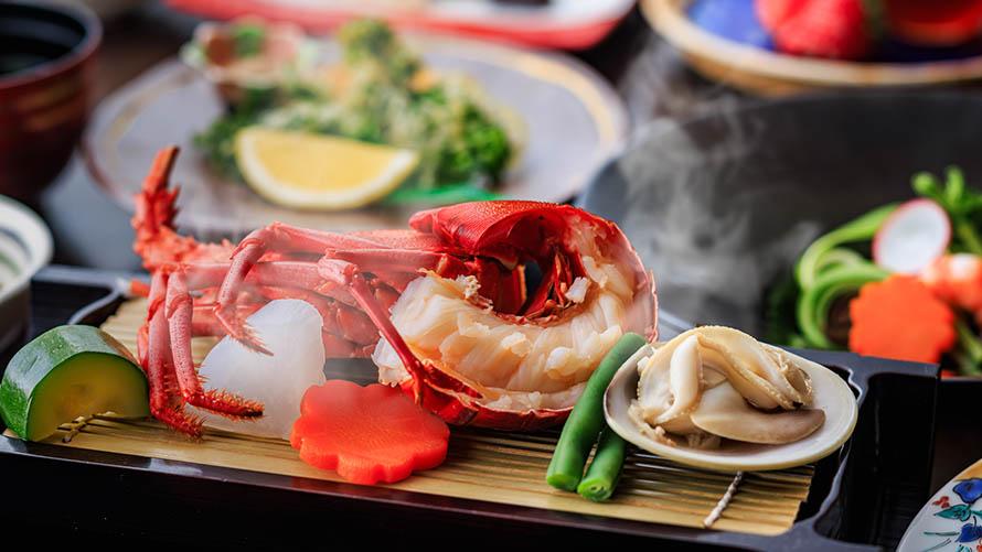 湯けむりに見立てた蒸篭し。伊勢海老(国産)、蛤を蒸しあげています。