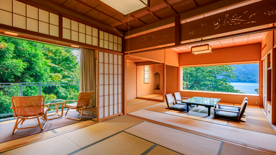 龍宮殿別館に3室のみご用意しております室内温泉浴室付き和室です。本間13畳と次の間8畳のゆとりある和室は、最大5名さままでご利用いただけます。全室湖側の客室からは、眼下に広がる芦ノ湖や湖を囲む箱根外輪山の雄大な景色をご覧いただけます。