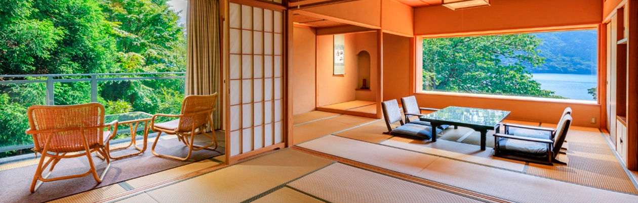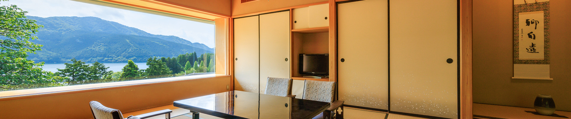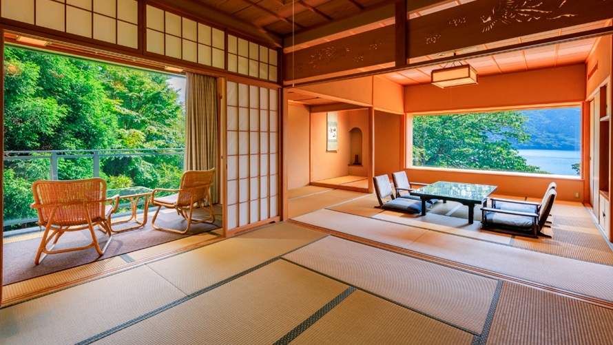 龍宮殿別館に3室のみご用意しております室内温泉浴室付き和室です。本間13畳と次の間8畳のゆとりある和室は、最大5名さままでご利用いただけます。全室湖側の客室からは、眼下に広がる芦ノ湖や湖を囲む箱根外輪山の雄大な景色をご覧いただけます。
