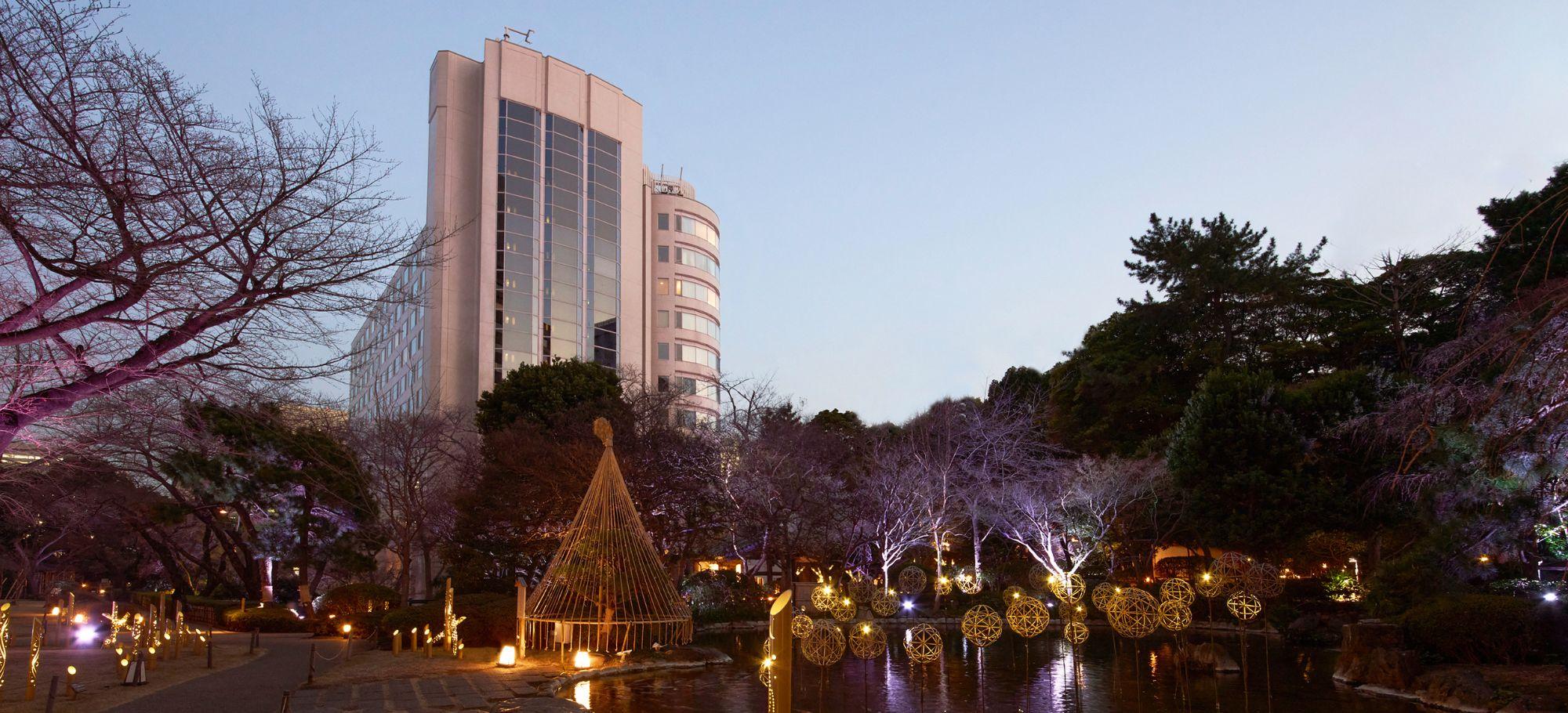 日本庭園を望み、白くそびえ立つグランドプリンスホテル新高輪の外観。