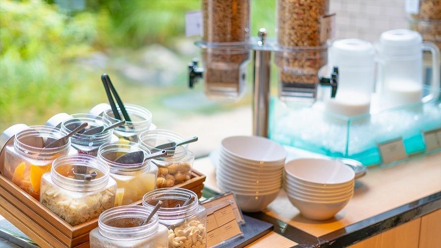 ベリーグラノーラ、オールブラン、玄米フレーク、コーンフレークの4種のシリアルに加え、ドライフルーツやナッツもお楽しみいただけます。
