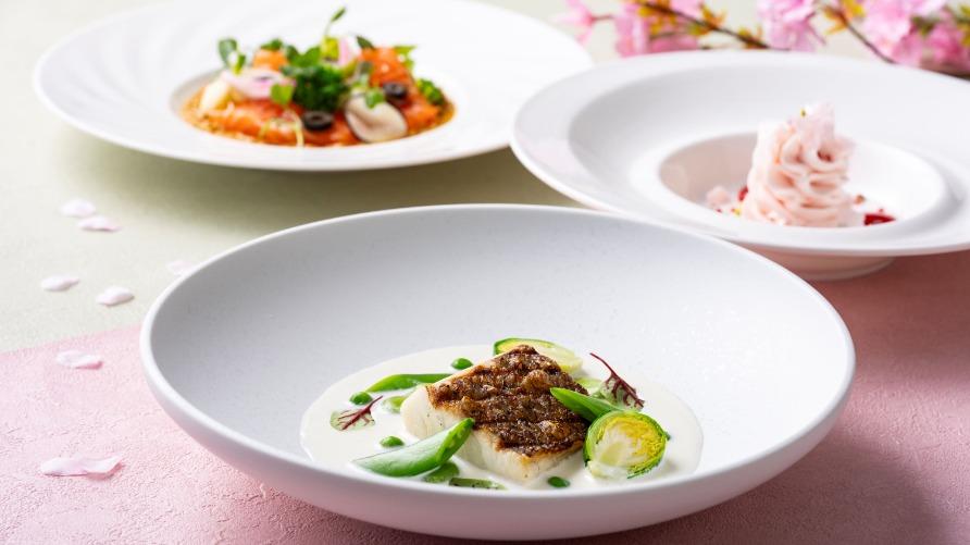 春の日本庭園をイメージし華やかに盛り付けた前菜や桜香るデザートなど、桜咲く季節ならではの味わいを余すことなくお愉しみいただけます。
