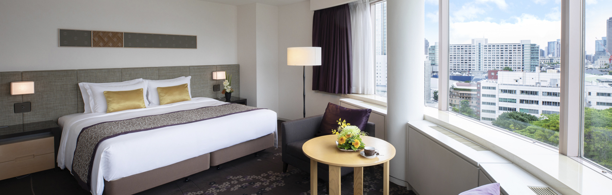 大きな曲面を描く窓と、ゆとりあるスペースを併せ持つワンルームスイート。広々としたバスルームでくつろぎのひとときを。