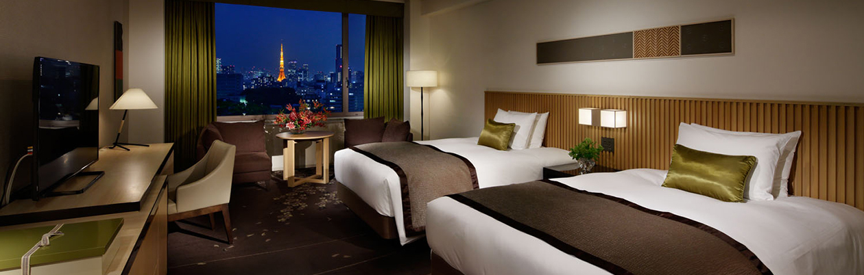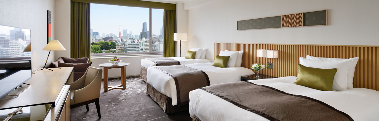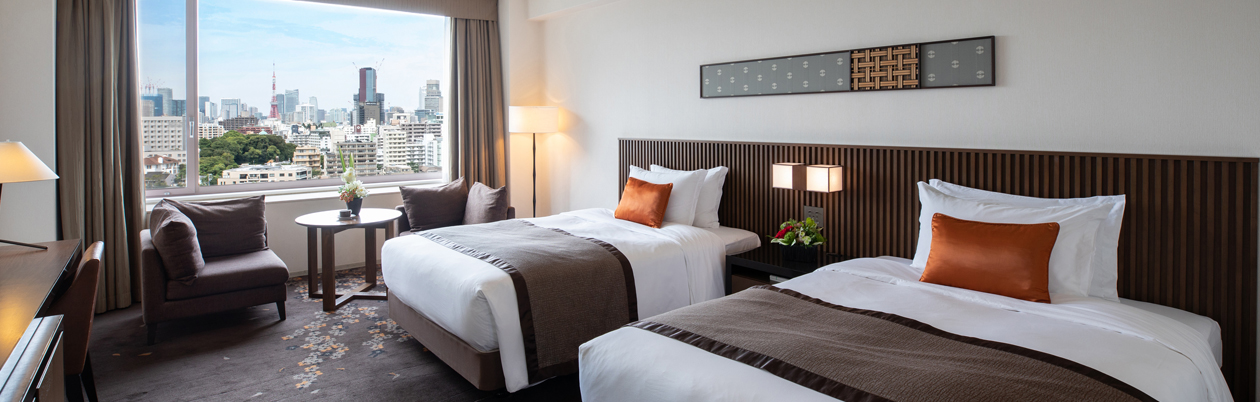 スタンダードでありながら46㎡の広さを持つツインルーム。お部屋の窓からは東京タワーをご覧いただけます。一部のお部屋ではエキストラベッドの追加で最大3名さままでご利用可能です。