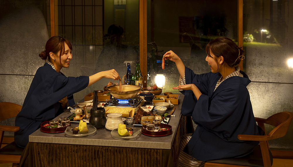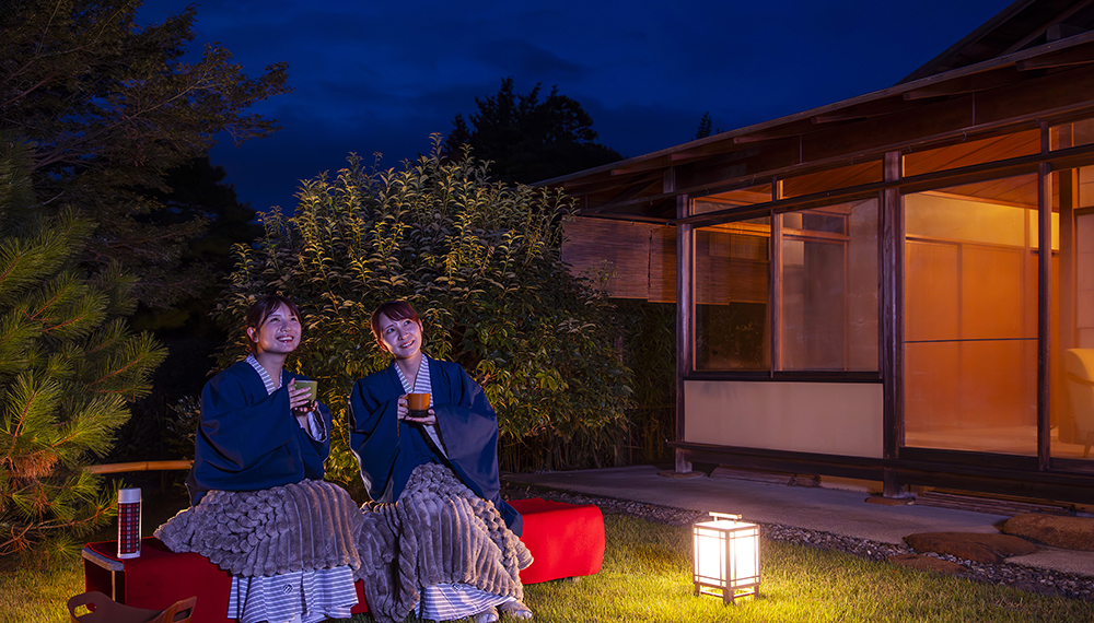 お部屋にはこたつをご用意。ぬくもりに包まれながら、天空の抹茶🄬フォンデュや冬の味覚をご堪能いただけます。