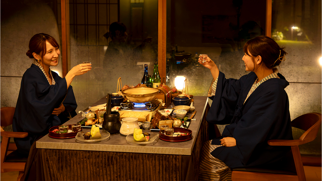 お部屋にはこたつをご用意。ぬくもりに包まれながら、天空の抹茶🄬フォンデュや冬の味覚をご堪能いただけます。