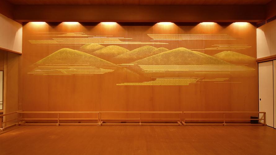 三養荘のお食事処『雄峰』の舞台壁面は、人間国宝で截金(きりかね)作家の江里佐代子氏の作品『峰光』を展示しております。