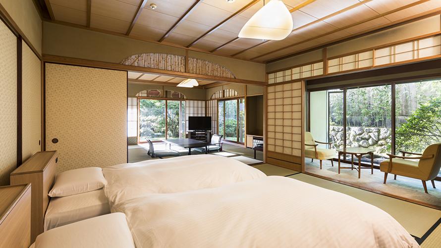 日本庭園で自然の音を楽しみ、お部屋のかけ流し温泉で湯浴みを存分にご堪能ください。
