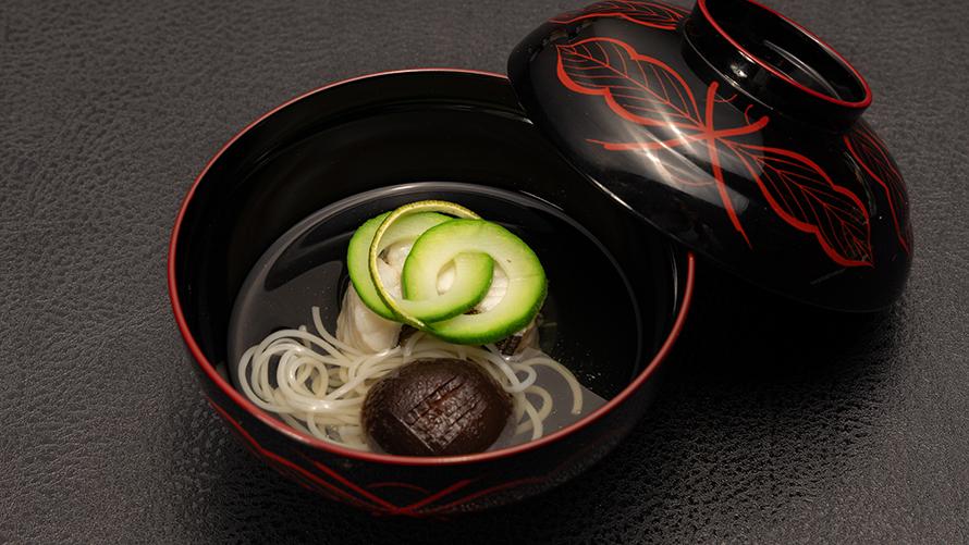 ◆御椀:鮎並葛叩き 三島産椎茸・小メロン・素麺・青柚子