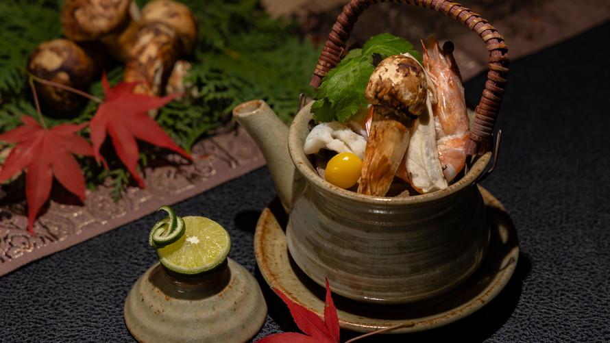 秋の香りと彩りを愉しむお献立をご用意いたしました。松茸や栗、銀杏など、秋の恵みを散りばめた旬菜に始まり、松茸の香り広がる土瓶蒸しなど、こころも温まる品々を取り揃えました。