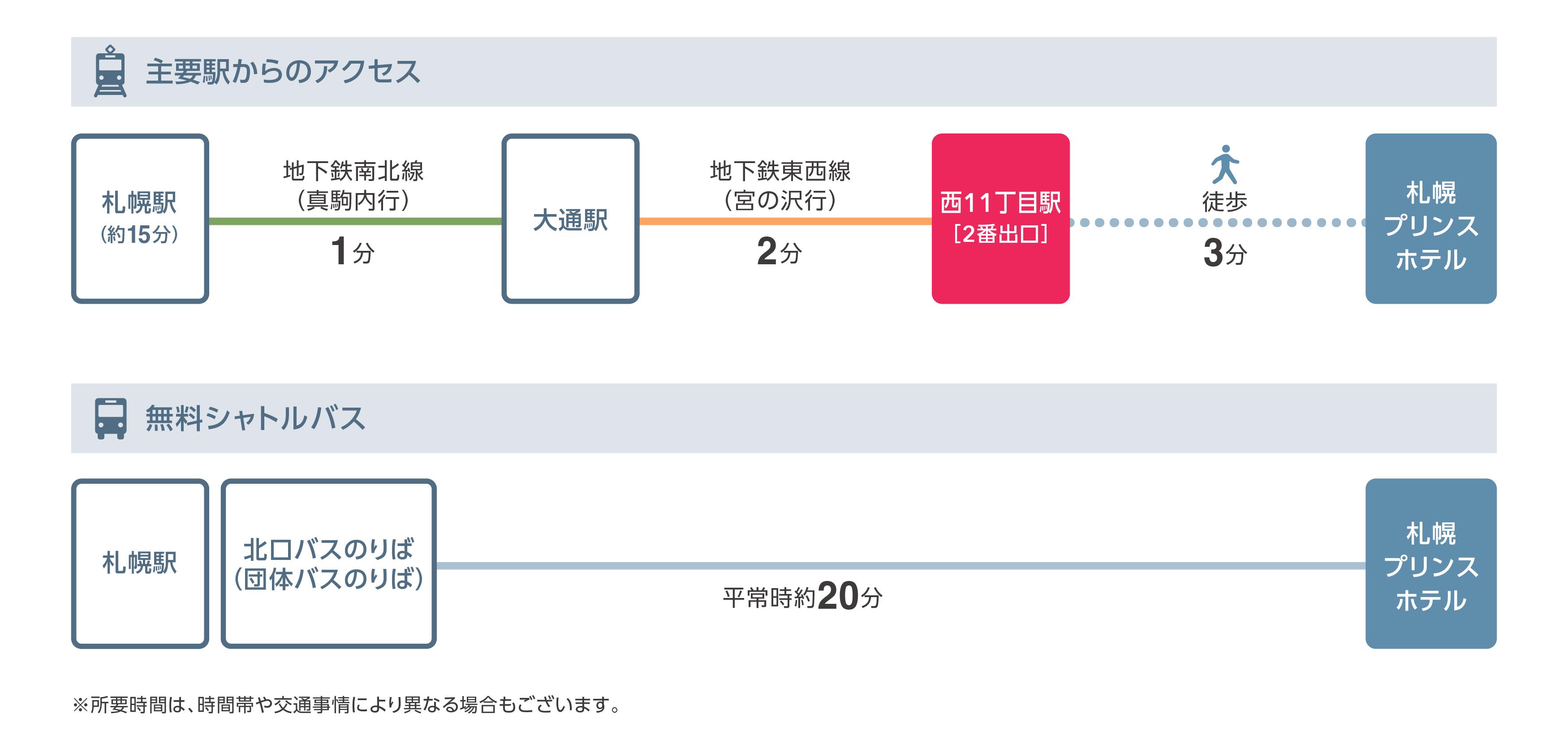 ホテル発 →札幌駅着 7:30A.M. (予約制) →7:50A.M. 8:30A.M. (予約制) →8:50A.M. 9:30A.M. (予約制) →9:50A.M. 10:30A.M.(予約制) →10:50A.M. 11:30A.M.(予約制) →11:50A.M. 1:30P.M. →1:50P.M. 2:30P.M. →2:50P.M. 3:30P.M. →3:50P.M. 4:30P.M. →4:50P.M. 時刻表(JR札幌駅→札幌プリンスホテル)