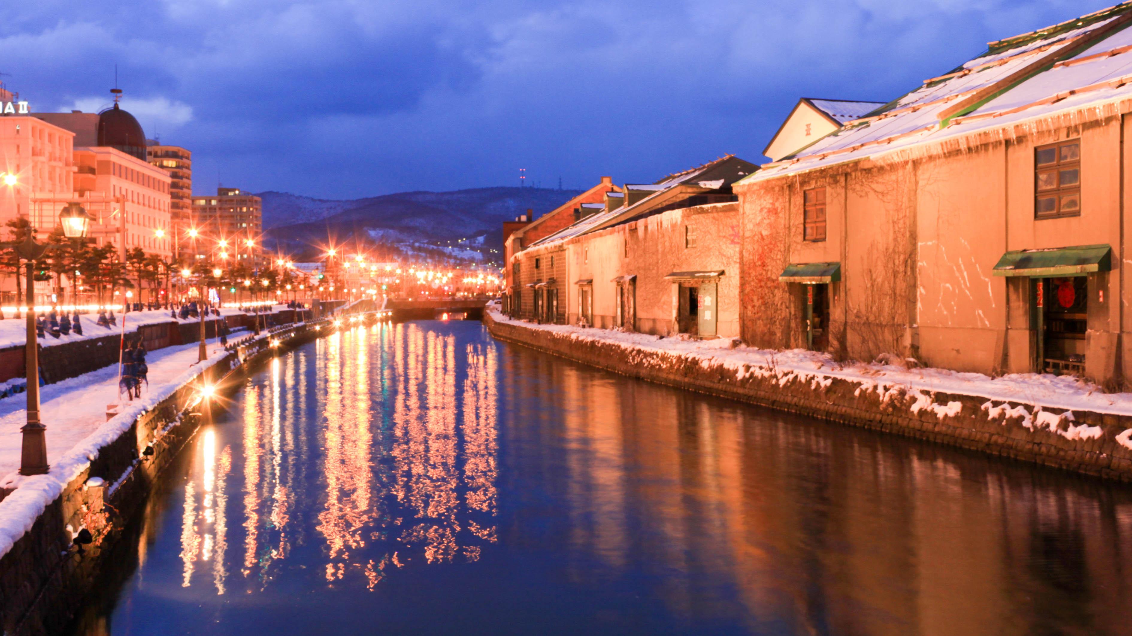 かつて商都として栄えた小樽の往時を今に伝える小樽運河。運河沿いは、石造倉庫が建ち並び、ガス燈が揺れるロマンチックな散策路です。