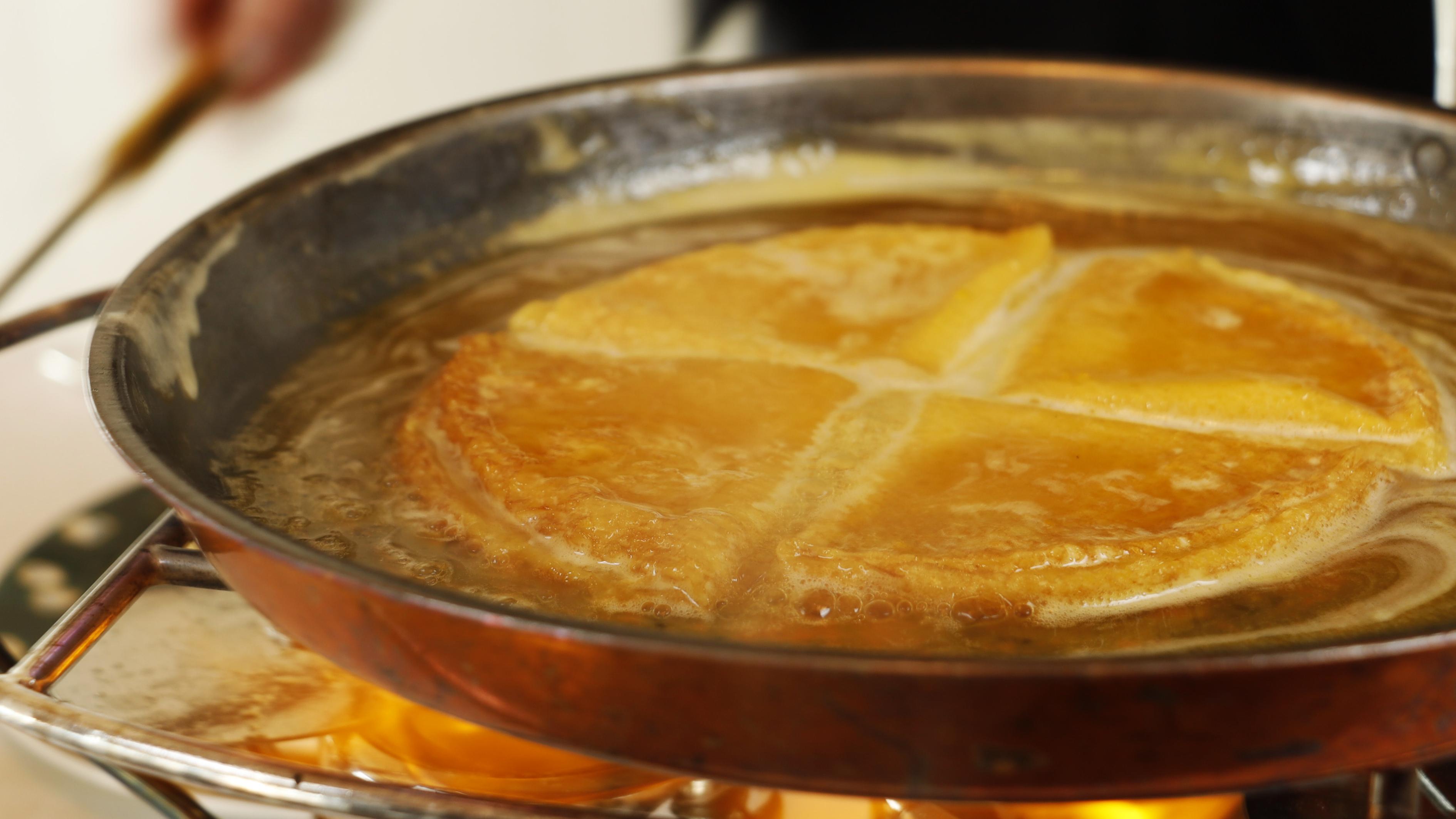 プティオードブルと、目の前で演出し仕上げるクレープシュゼット、紅茶をセットにした土休日限定のプランです。