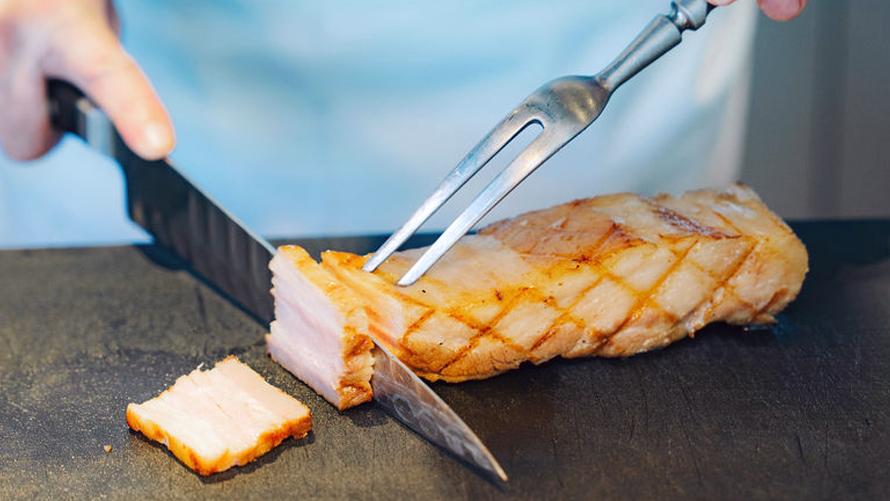 北海道産の良質な豚肉を使用した厚切りベーコンのグリルを、ライブキッチンでご提供。