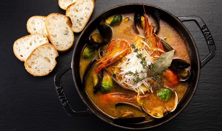 サフラン、にんにく、ハーブとともに煮込んだ魚介のスープ