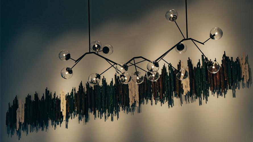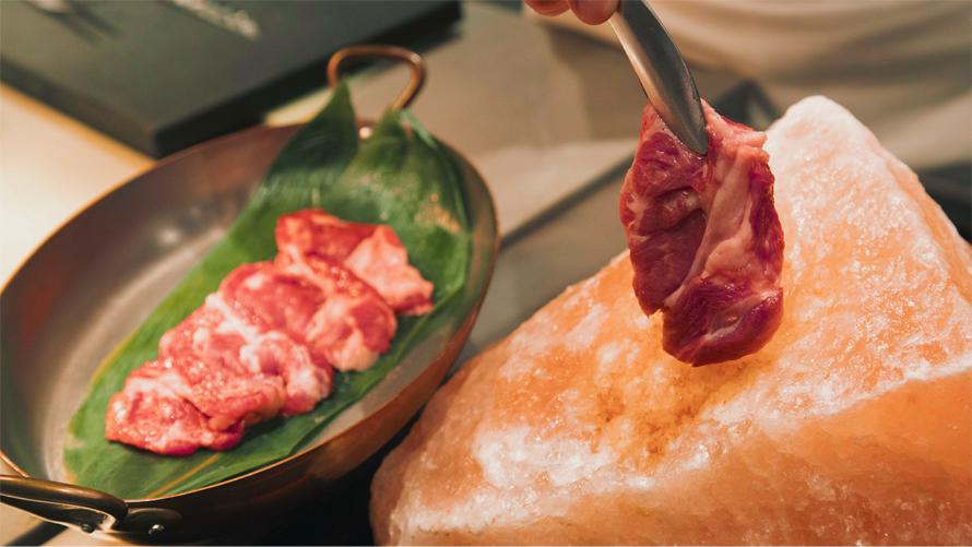 ラム肉を岩塩の塊の上で焼き上げます。塩ジンギスカン風に
