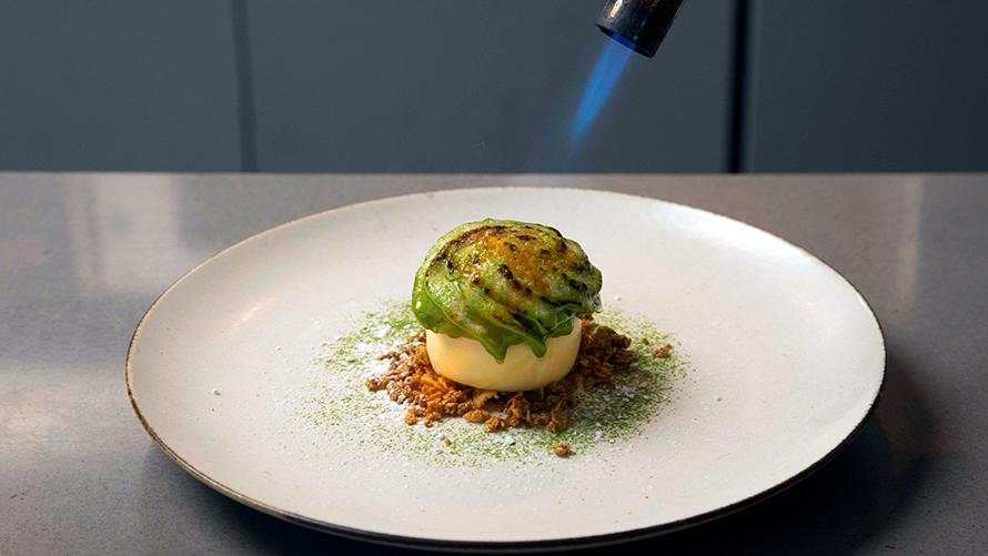 くま笹茶を使ったエスプーマの表面をキャラメリゼにしたブリュレ
