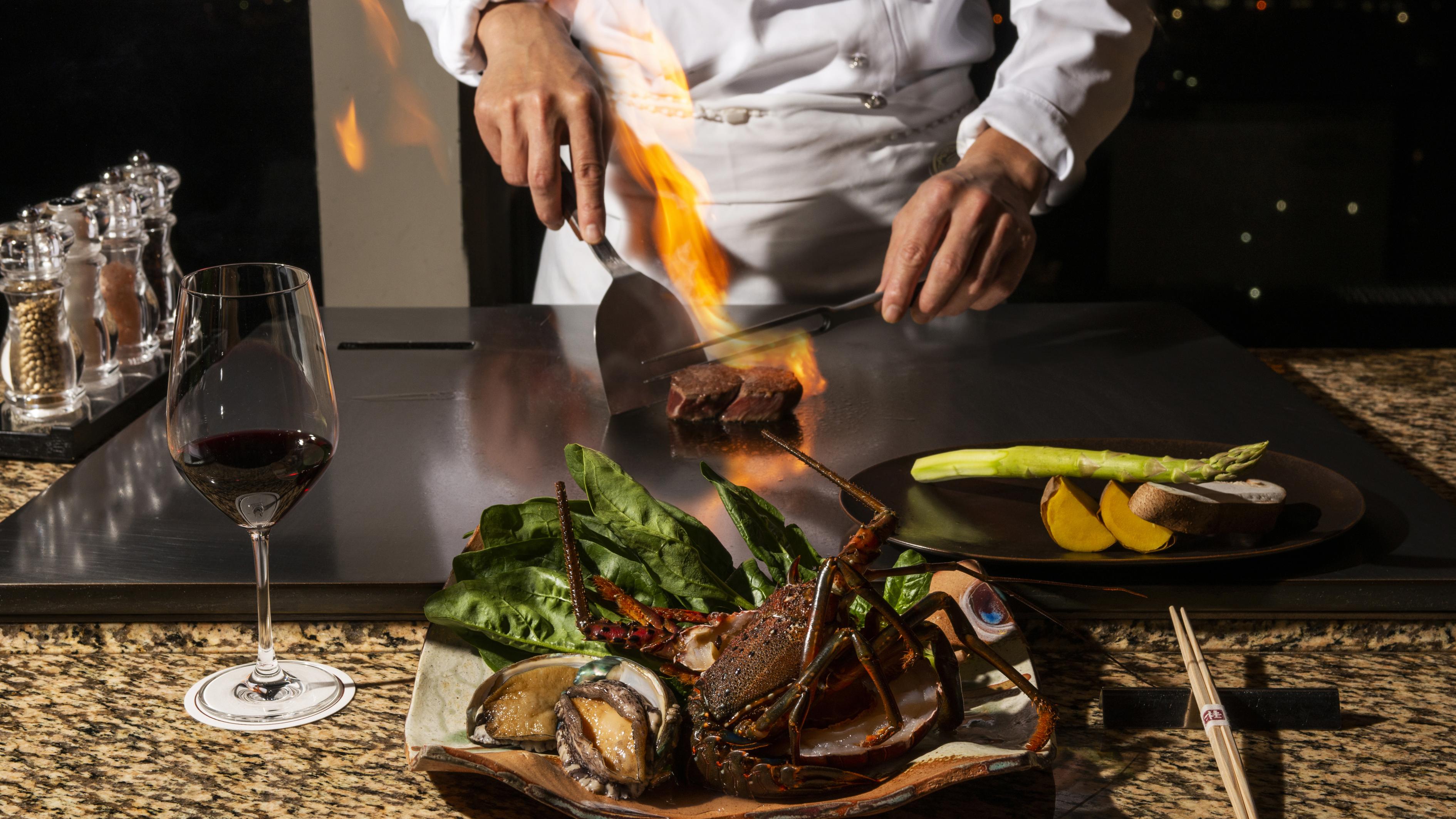 国産伊勢海老(半身)と活鮑の鉄板焼き トマトとケッパーのバターソース