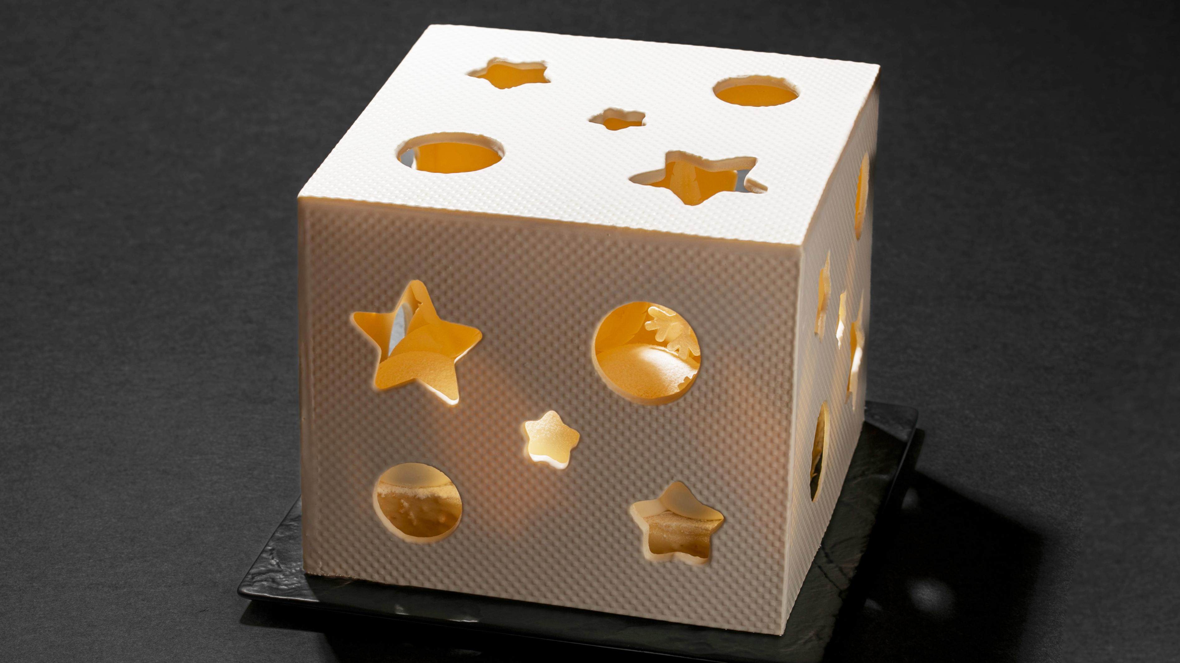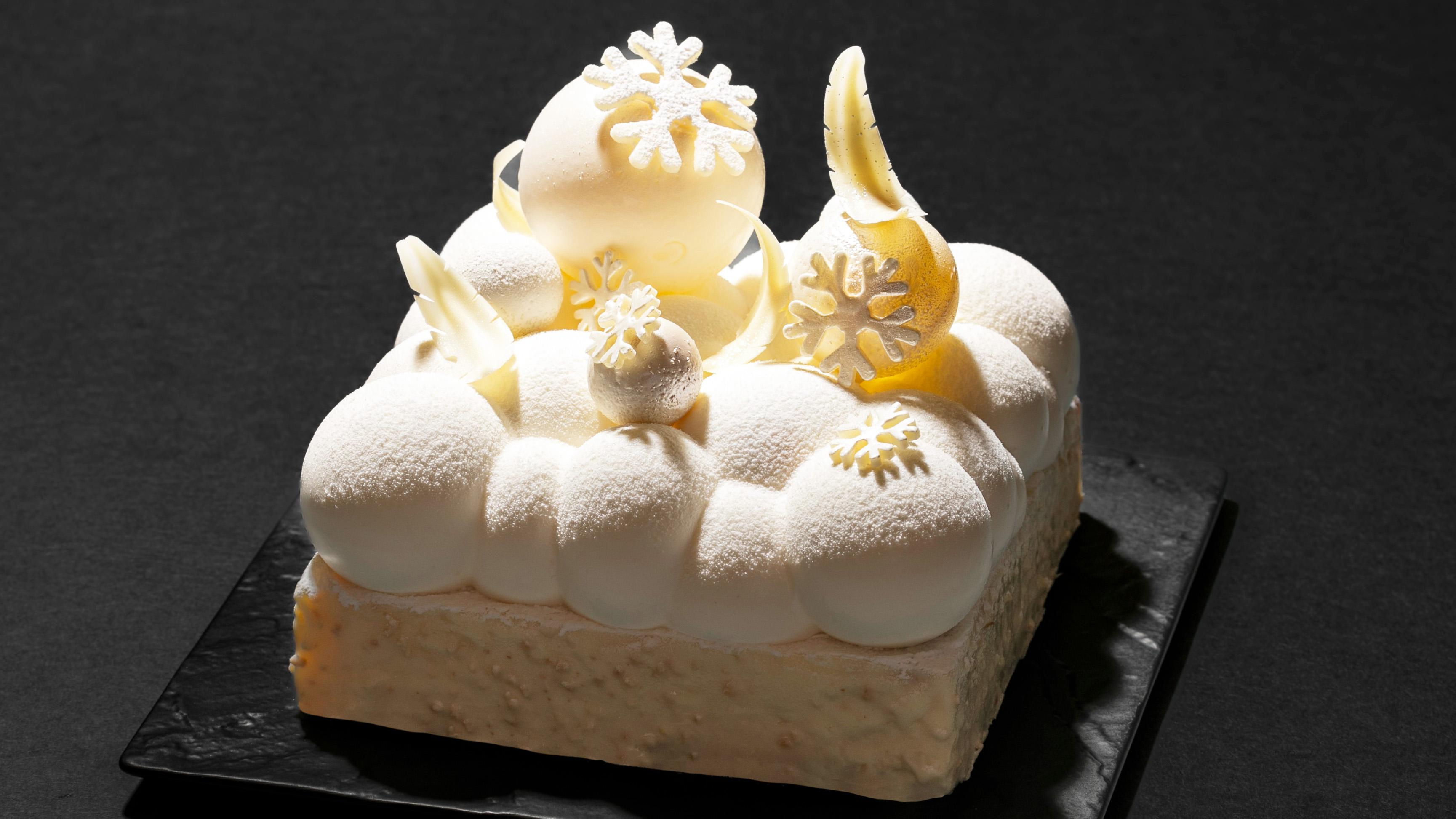 ホワイトチョコレートのボックスでクリスマスプレゼントを表現した、初雪のように、輝きと繊細さを纏った純白のケーキ。