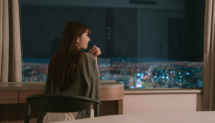 Designed with the motif of the evening sky, features like positioning the double room's bed facing the window maximize the high-floor vistas while ensuring spacious comfort.