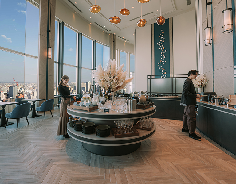 The club lounge, whose theme colors are the sky blue of the magic hour and the gradation of blue, and the guest rooms, which utilize natural textures such as wood, leather, and Ezo Japanese paper, are interwoven into a high quality space. A fusion of resort atmosphere and urban flair.