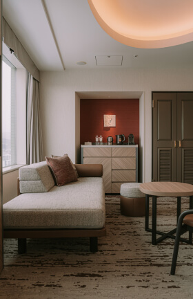 A calm and chic space with blue as the theme color, inspired by the majestic Toyohira River. From the upper floors guests can enjoy views of the changing seasons. In addition to twin and triple rooms, there are also connecting rooms that can accommodate four people.